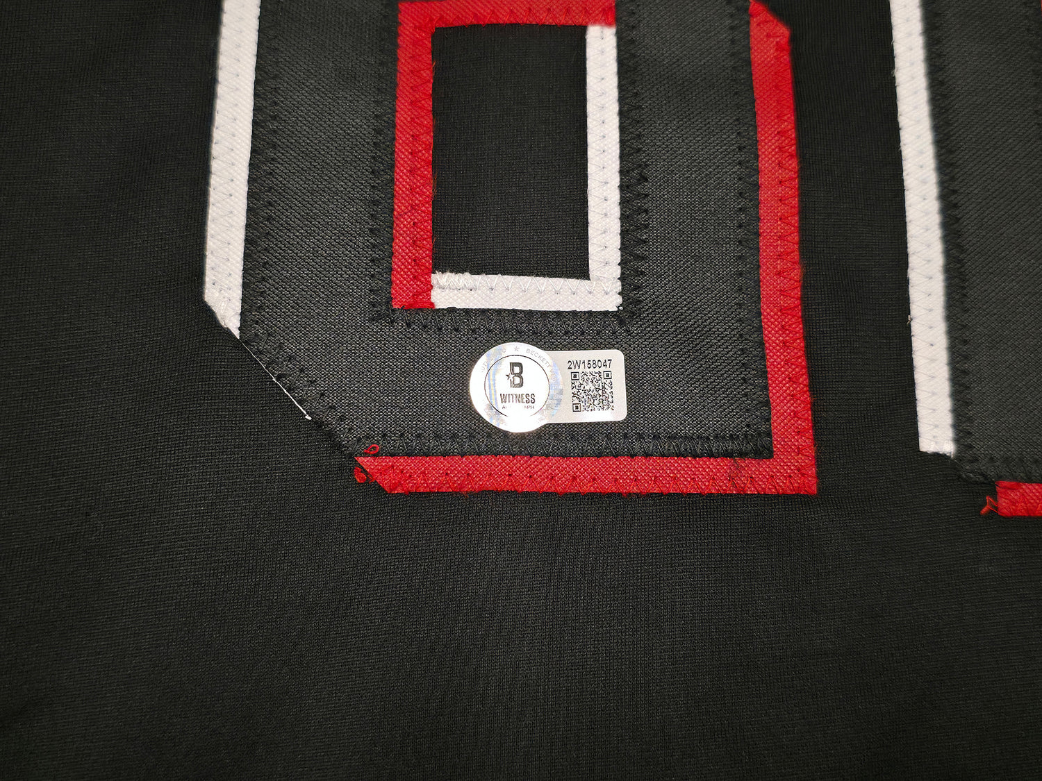 This is a custom black jersey—approximately size XL—with no name brand, designed for display and collector appeal. It features high-quality sewn-in name and numbers to replicate an authentic on-field appearance. Each jersey comes with a Beckett Authentication Services (BAS) Witnessed Certificate of Authenticity, which includes their tamper-proof witness hologram to guarantee the signature’s legitimacy.