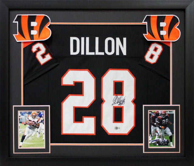 Celebrate a legendary era of Cincinnati Bengals football with this Corey Dillon Autographed Black Pro Style Framed Jersey. Personally signed by the NFL icon himself, this collectible pays tribute to Dillon’s electrifying career, highlighted by his powerful running style and record-setting performances as a fan-favorite of the Bengals. Ideal for collectors, die-hard fans, and sports enthusiasts, this framed jersey is more than a display piece—it's a piece of NFL history.