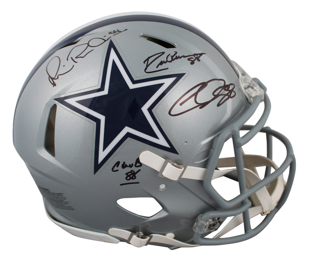Own a piece of Dallas Cowboys history with this Autographed Riddell Authentic Full-Size Speed Proline Helmet, personally signed by Cowboys legends Drew Pearson, CeeDee Lamb, and Michael Irvin. This exclusive collectible features the inscription "Club 88 (Pearson)", celebrating the historic legacy of the Cowboys' elite receivers.