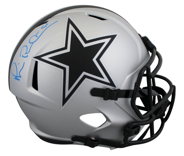 Celebrate the legacy of a Dallas Cowboys legend with this Autographed Dallas Cowboys Alternate Rave Riddell Full Size Speed Replica Helmet, personally signed by NFL Hall of Famer Michael Irvin. A cornerstone of the Cowboys’ dynasty in the 1990s, Irvin is known for his electrifying plays and championship pedigree. This collector’s item is not only a tribute to his storied career, but a standout centerpiece for any sports memorabilia collection.