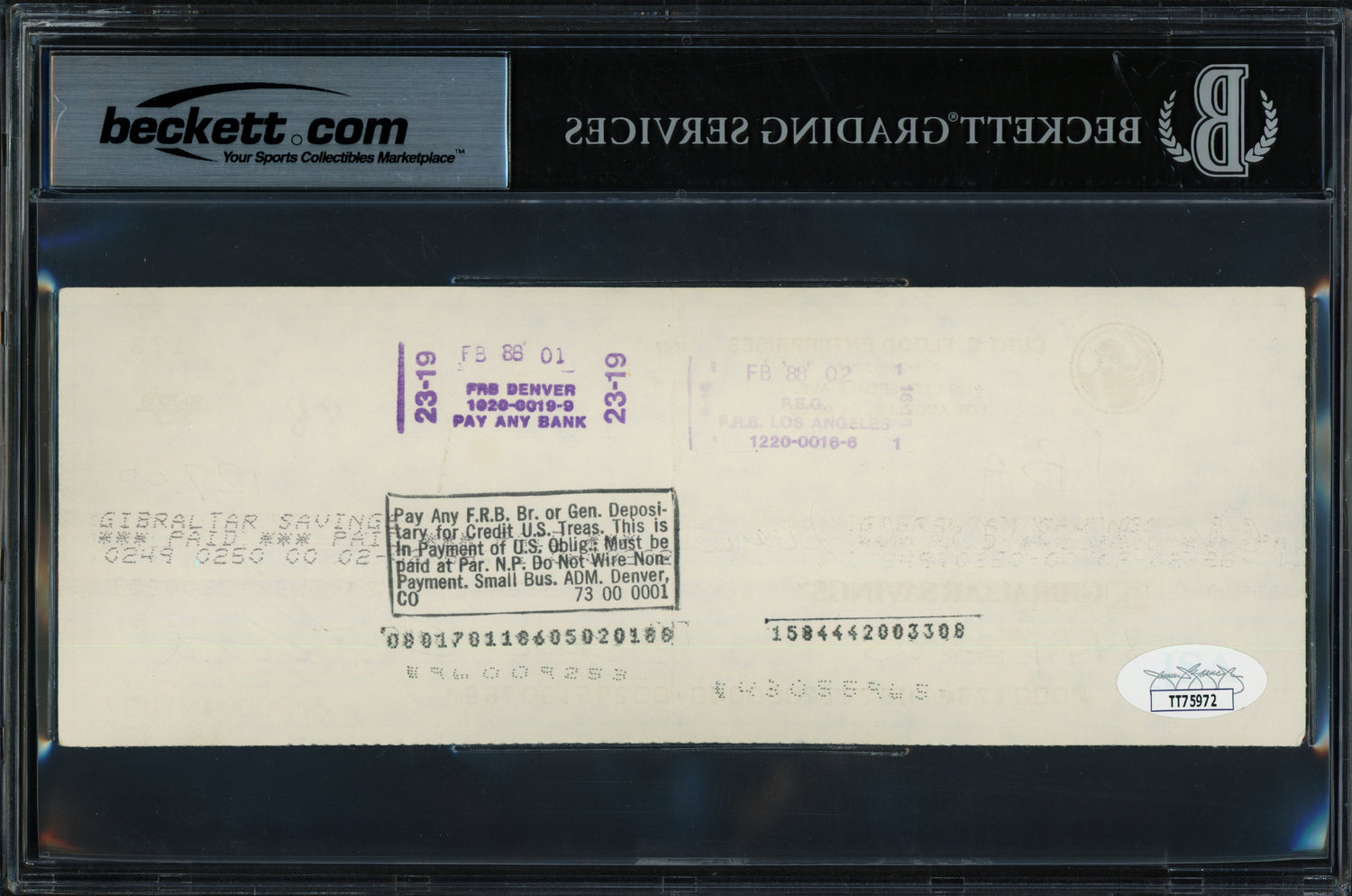 This is an outstanding collectible—a hand-signed check by Curt Flood, a pivotal figure in Major League Baseball history. Authenticated and encapsulated by Beckett Authentication Services (BAS), this item offers both authenticity and long-term preservation for serious collectors and fans alike. Curt Flood is not only remembered as a talented outfielder for the St. Louis Cardinals, contributing to their 1964 and 1967 World Series championships, but also for revolutionizing the game by challenging the reserve clause, eventually paving the way for modern free agency. A signed check from such an influential player carries immense historical and cultural weight in the world of sports memorabilia.