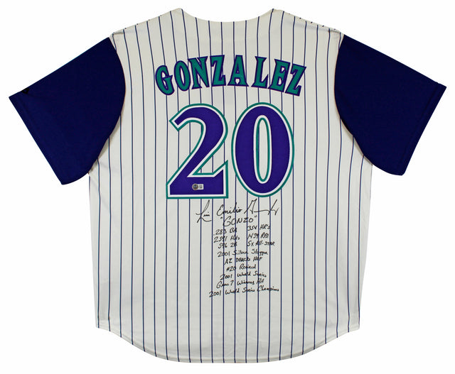 D-Backs Luis Gonzalez "Career Stat" Signed White Pinstripe Majestic Jersey BAS W