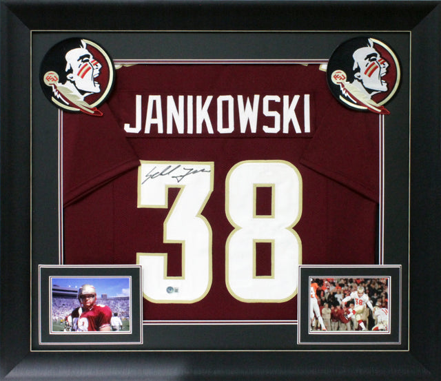 This Autographed Maroon Pro Style Framed Jersey has been personally signed by Sebastian Janikowski, legendary kicker for the Florida State Seminoles, making it a must-own collectible for devoted FSU fans and memorabilia collectors. Janikowski's standout college career, including winning the Lou Groza Award twice and becoming a first-round NFL draft pick, cemented his place in Seminoles history — and now you can own a direct piece of that legacy. Carefully authenticated and beautifully displayed, this signed framed jersey offers both historical significance and stunning visual appeal for your display wall or collection.
