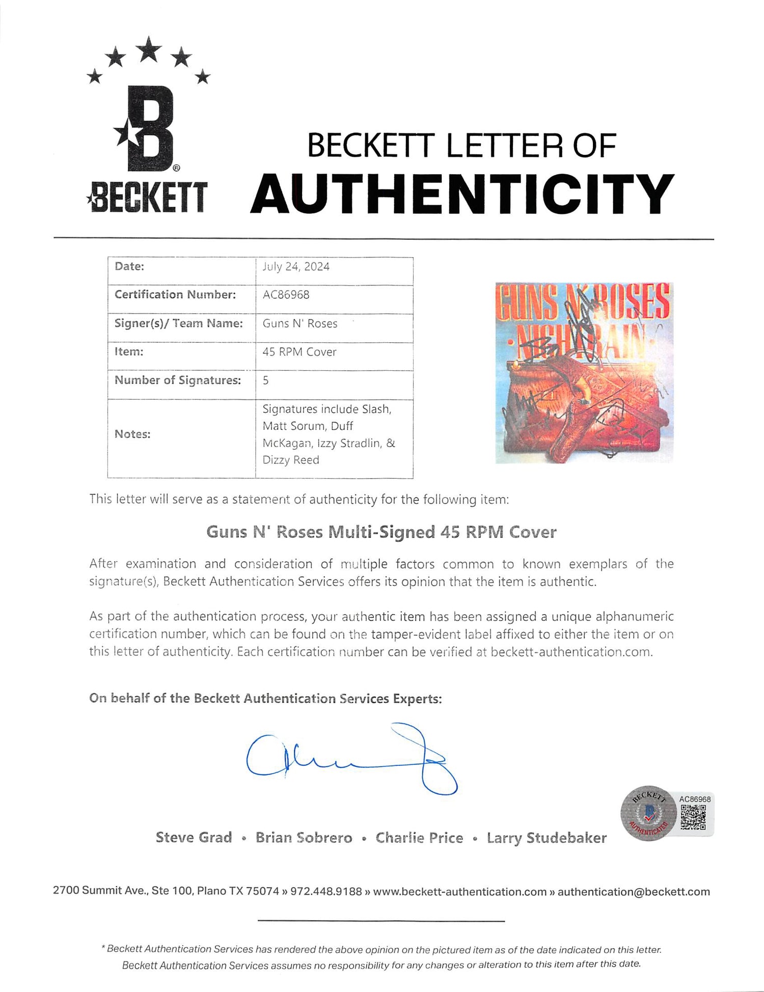 Own a piece of rock history with this Autographed Nightrain 45 RPM Album Cover with Vinyl, personally signed by Slash, Matt Sorum, Duff McKagan, Izzy Stradlin, and Dizzy Reed of Guns N' Roses. A must-have for collectors and fans, this rare signed memorabilia celebrates one of the band’s most iconic hits.
