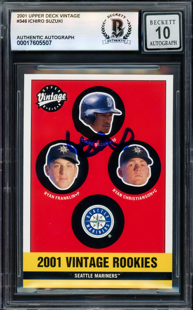 Ichiro Suzuki Autographed 2001 Upper Deck Vintage Rookie Card #346 Seattle Mariners Auto Grade Gem Mint 10 Beckett BAS Stock #238927