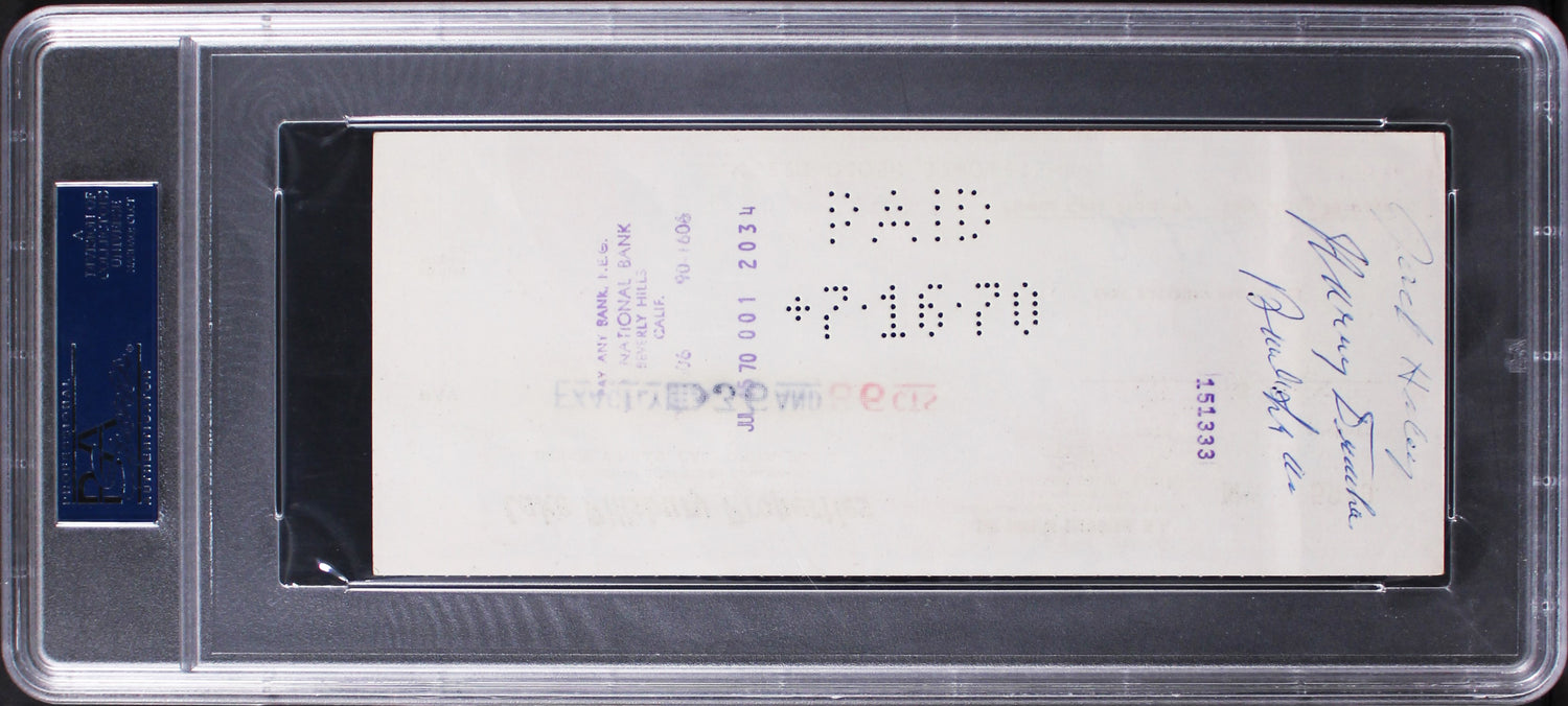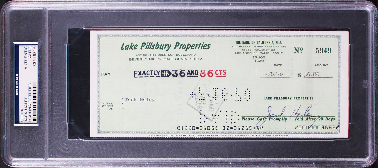 Own a rare piece of Hollywood history with this Autographed Check Double Signed by Jack Haley, the beloved Tin Man from The Wizard of Oz. This authentic 1970 Lake Pillsbury Properties 3.5" x 8.5" check is a unique collectible that celebrates one of cinema's most iconic films. Authenticated and slabbed by PSA/DNA, ensuring full verification of its authenticity.