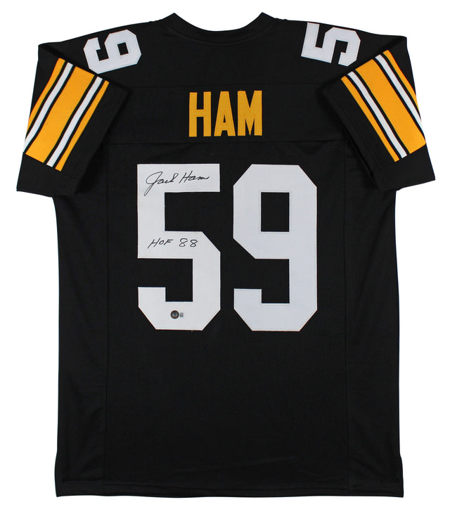 Own a piece of Pittsburgh Steelers history with this Autographed Black Pro Style Jersey, personally signed by Hall of Famer Jack Ham with the inscription "HOF 88." A legendary linebacker and key member of the Steelers' iconic "Steel Curtain" defense, Ham played an instrumental role in the team’s dominance during the 1970s, helping secure four Super Bowl championships.