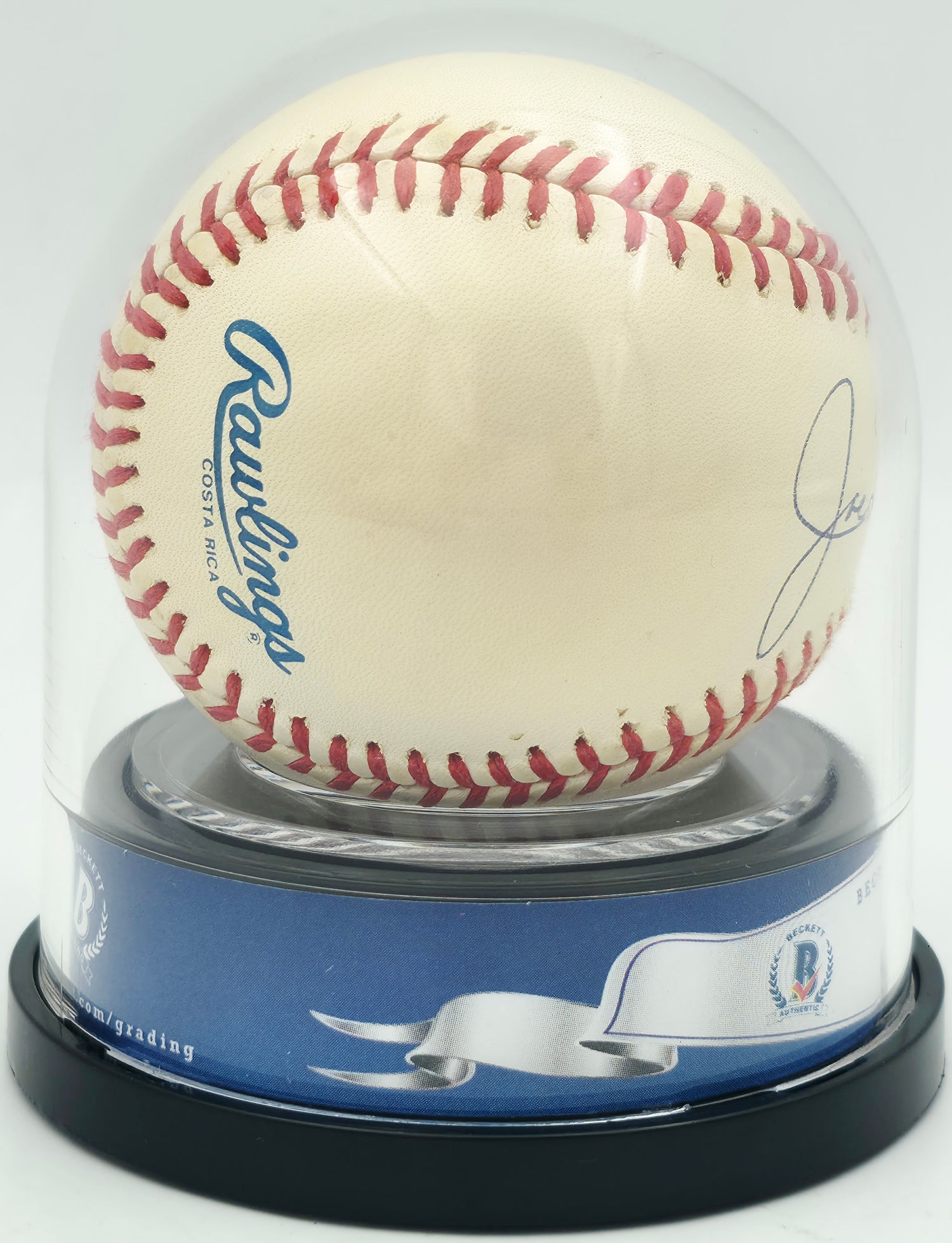 This rare item has been hand signed by Joe DiMaggio and authenticated by Beckett Authentication Services (BAS), ensuring its authenticity and long-term value. Encapsulated in Beckett's tamper-proof holder, this baseball features a Mint 9 graded signature, offering pristine autograph quality ideal for display.