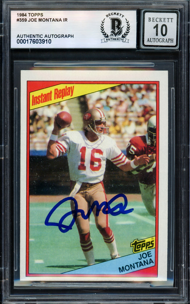 Joe Montana Autographed 1984 Topps Card #359 San Francisco 49ers Auto Grade Gem Mint 10 Beckett BAS Stock #238906 is backordered and will ship as soon as it is back in stock.