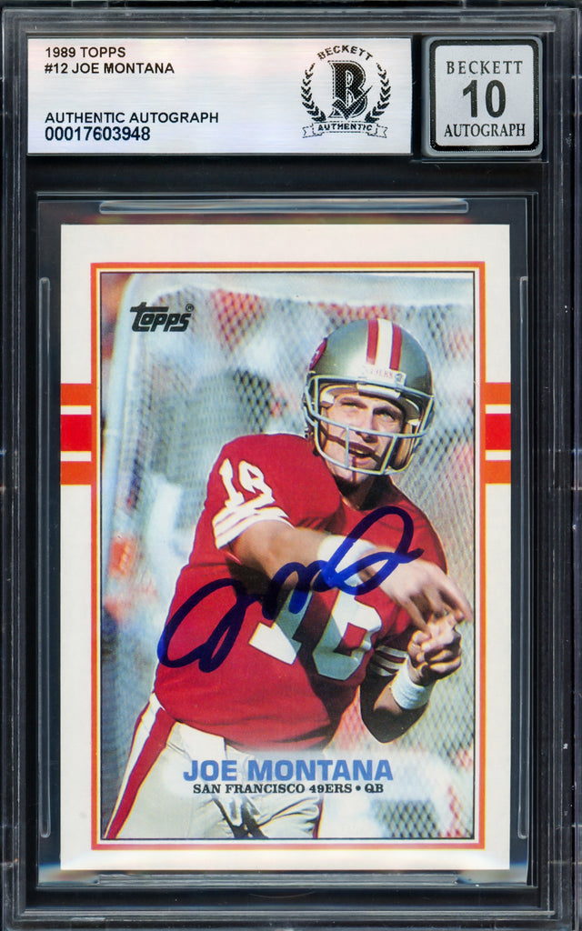 Joe Montana Autographed 1989 Topps Card #12 San Francisco 49ers Auto Grade Gem Mint 10 Beckett BAS Stock #238908