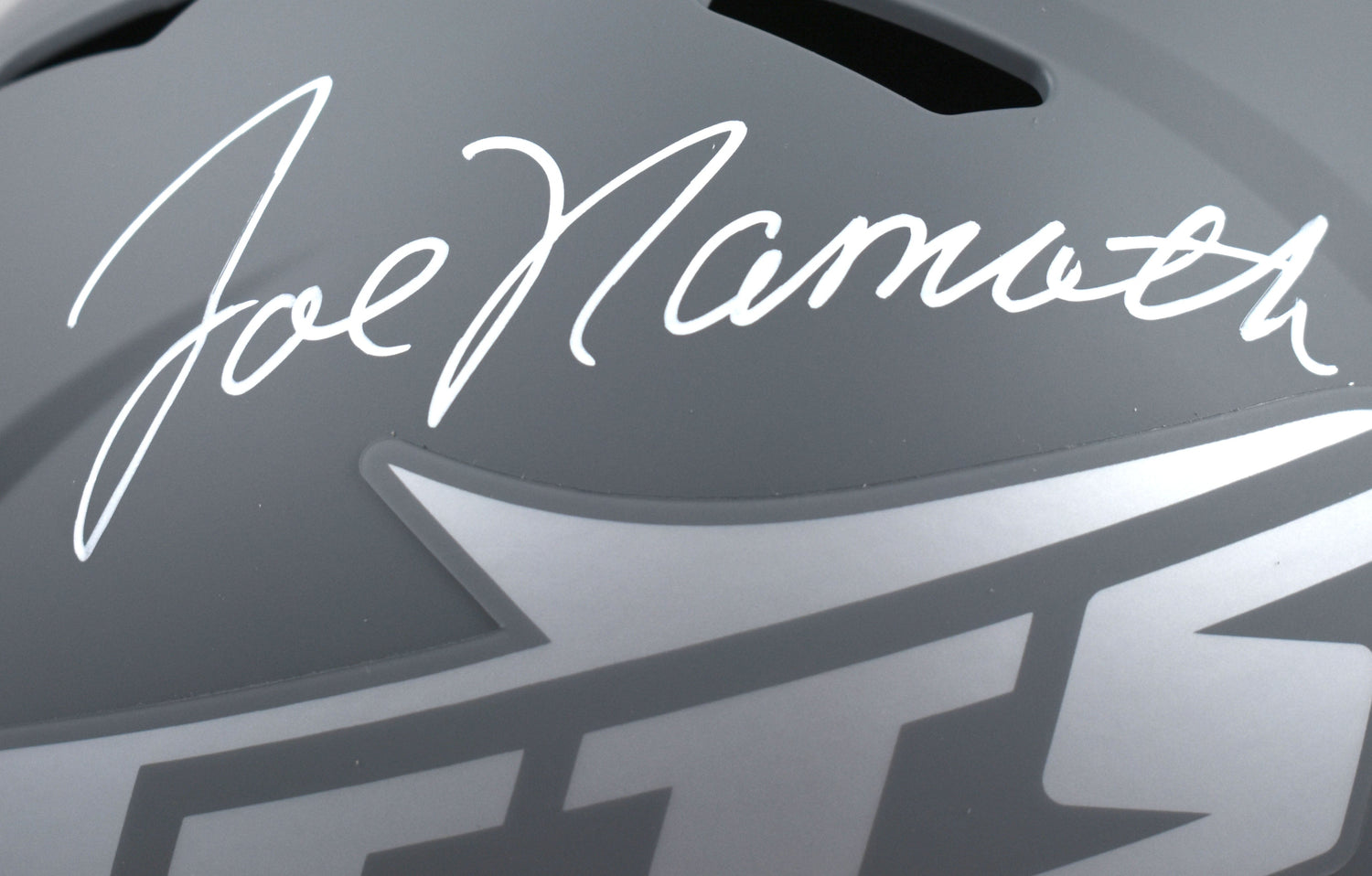 Own a piece of football history with this Joe Namath Autographed New York Jets Riddell Full-Size Slate Speed Replica Helmet. A must-have for die-hard Jets fans and memorabilia collectors, this signed helmet celebrates the legacy of one of the most legendary quarterbacks in NFL history.