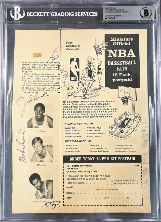 Capture a piece of basketball history with this rare and beautifully preserved 1970-71 8x11 Magazine Page Photo, hand signed by four legendary players: John Brisker, Chuck Williams, Mike Lewis, and Joe Kennedy. This vintage collectible offers a unique glimpse into a classic era of professional basketball and features authentic signatures that make it a standout addition to any memorabilia collection.