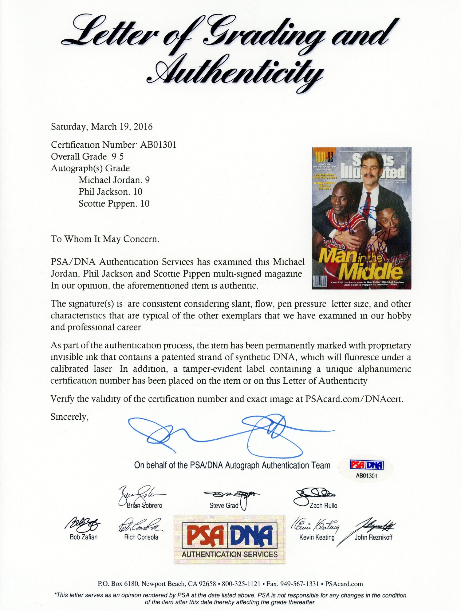 - Hand-signed by Michael Jordan, Scottie Pippen, and Phil Jackson