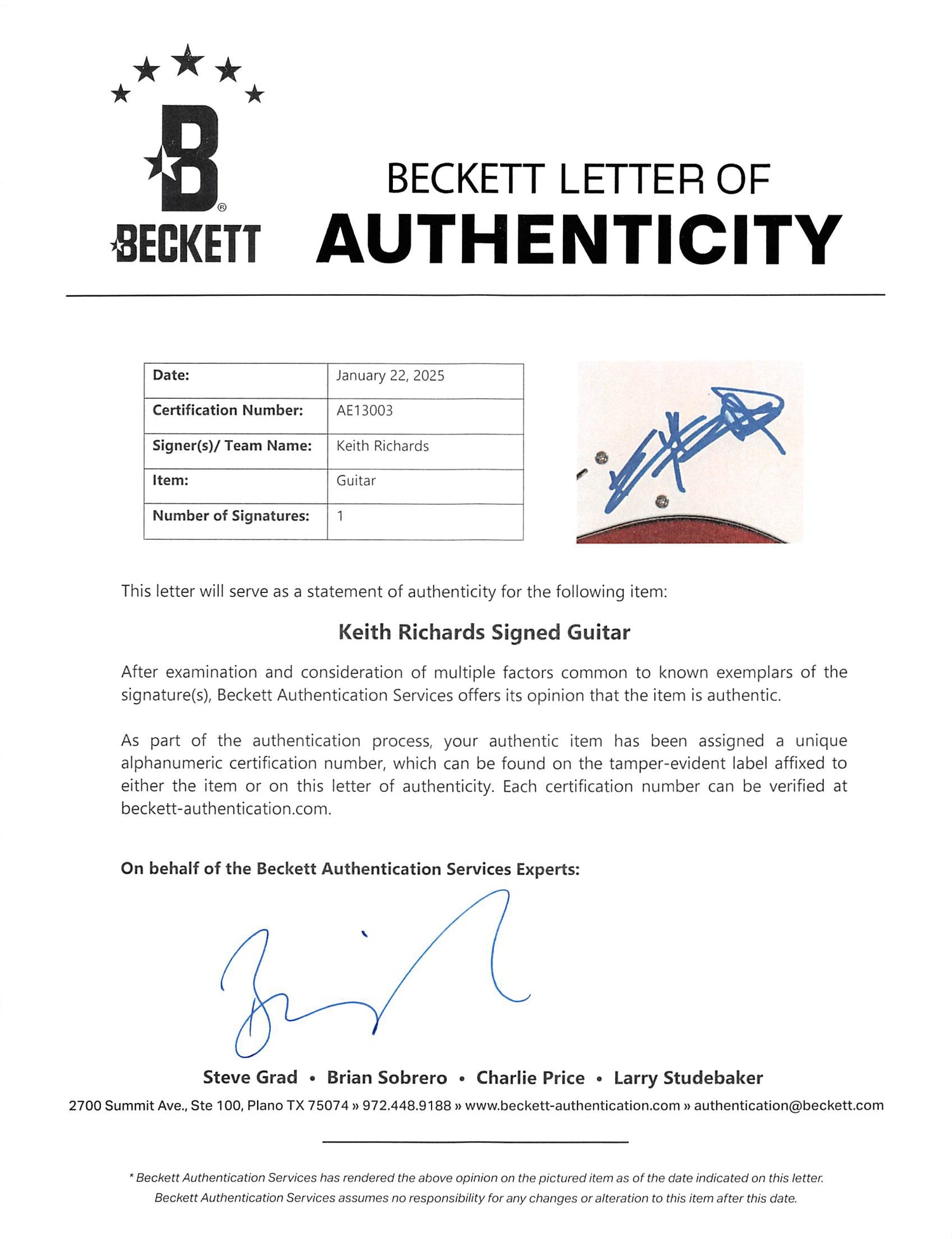 Whether you're a lifelong Rolling Stones fan or a memorabilia collector, this authentic Keith Richards autographed guitar is a priceless addition to any collection. Secure this iconic piece today!
