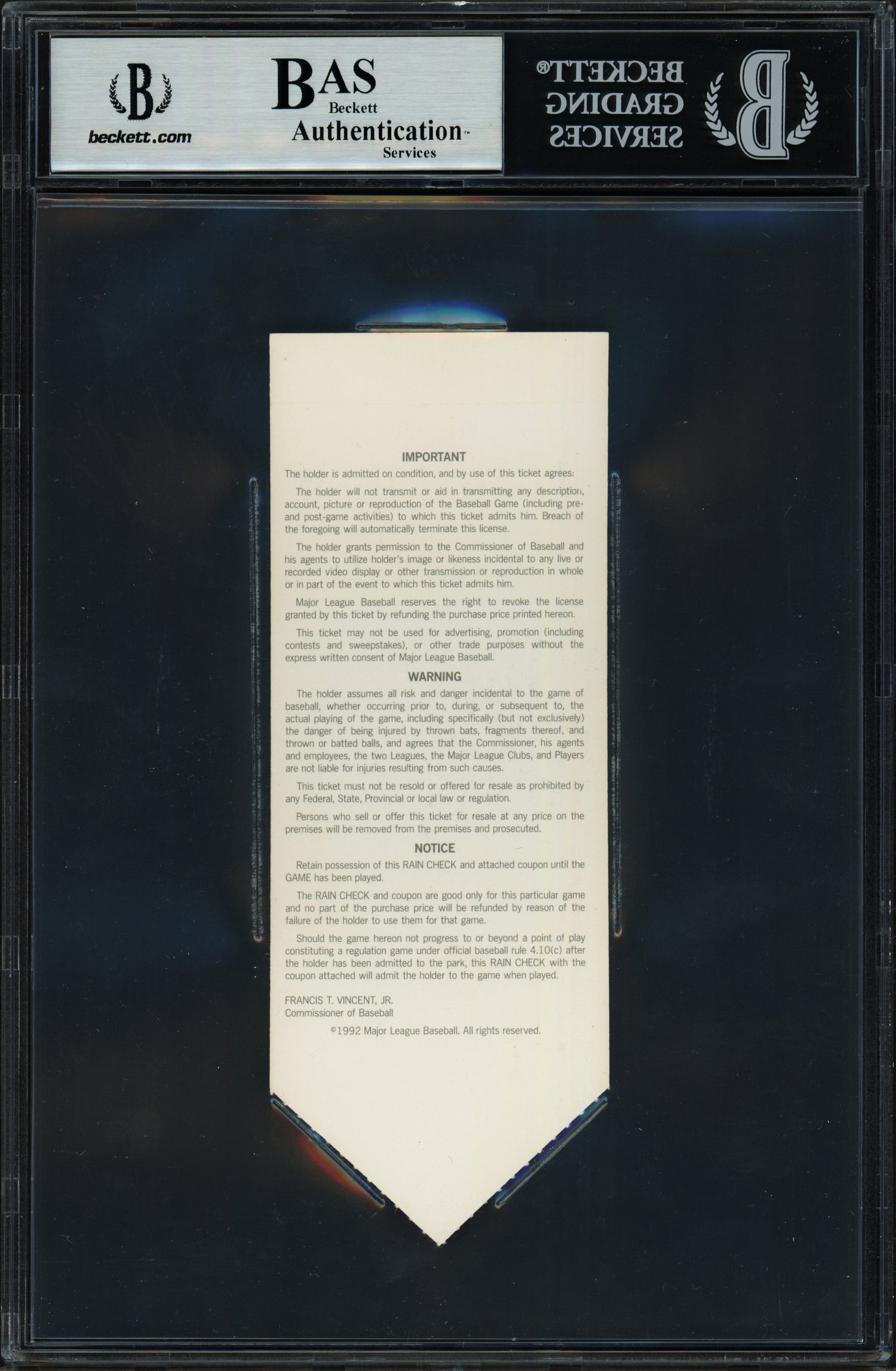 This collectible is a must-have for fans of 1990s baseball and the legendary Ken Griffey Jr. This authentic 1992 All-Star Game Ticket, approximately 2.5 x 5.5 inches in size, has been personally hand-signed by Ken Griffey Jr. and uniquely inscribed with "92 AS MVP", celebrating his standout performance and MVP honor at the 1992 Midsummer Classic. A memorable moment in MLB history, Griffey’s MVP recognition came after going 3-for-3 at the plate, helping to lead the American League to a 13-6 victory—cementing his status as one of the game's greatest talents. Professionally authenticated and encapsulated by Beckett Authentication Services (BAS), this ticket has been sealed in a tamper-proof holder to guarantee its quality and legitimacy for years to come.