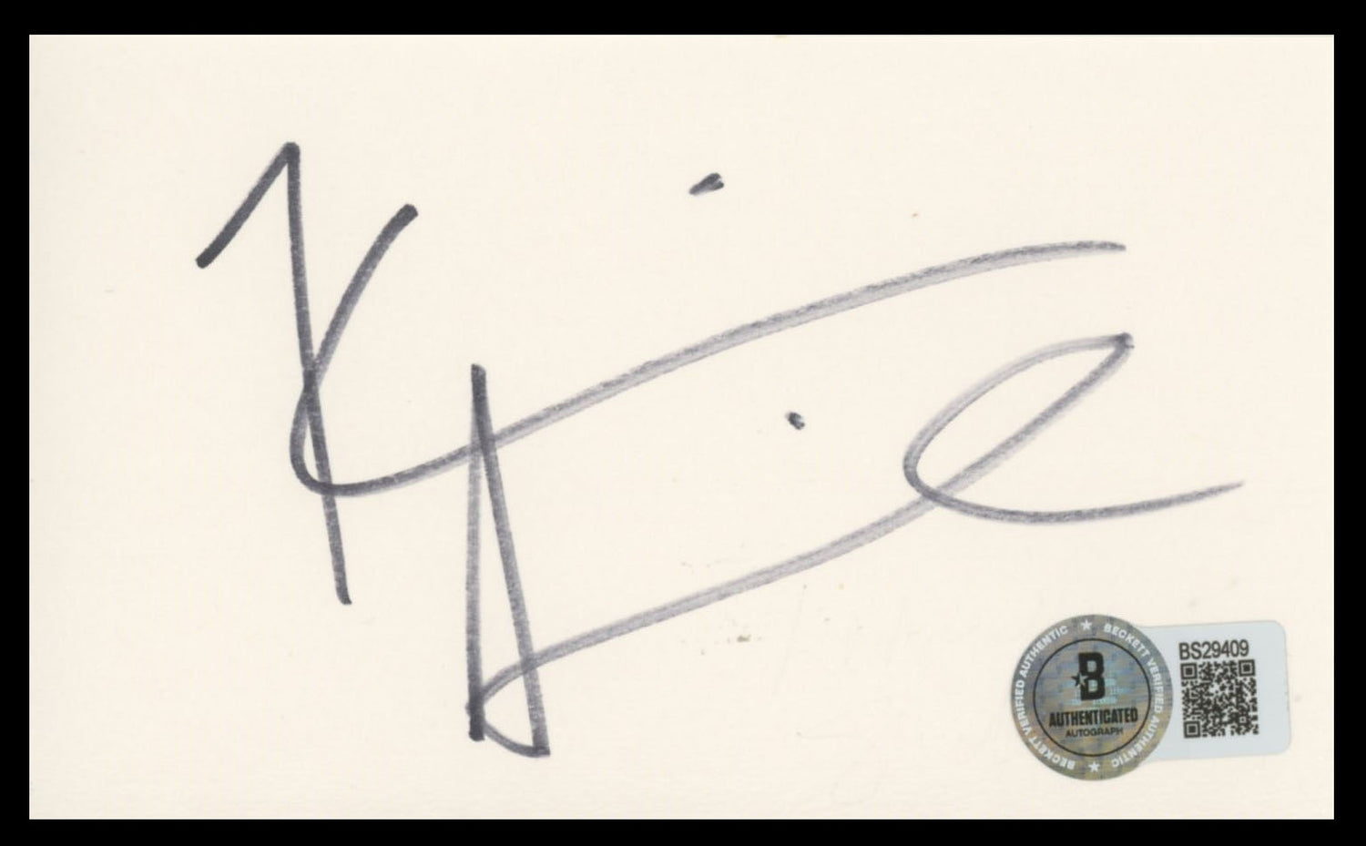 This signed index card has been authenticated by Beckett Authentication Services (BAS), one of the most trusted names in autograph verification. A tamper-evident BAS hologram sticker featuring a scannable QR code is affixed directly to the item, ensuring instant and reliable authentication through the BAS website.