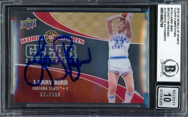 Larry Bird Autographed 2010 Upper Deck World of Sports Clear Competitors Card #CC4 Boston Celtics Auto Grade Gem Mint 10 #513/550 Beckett BAS Witness #16862769