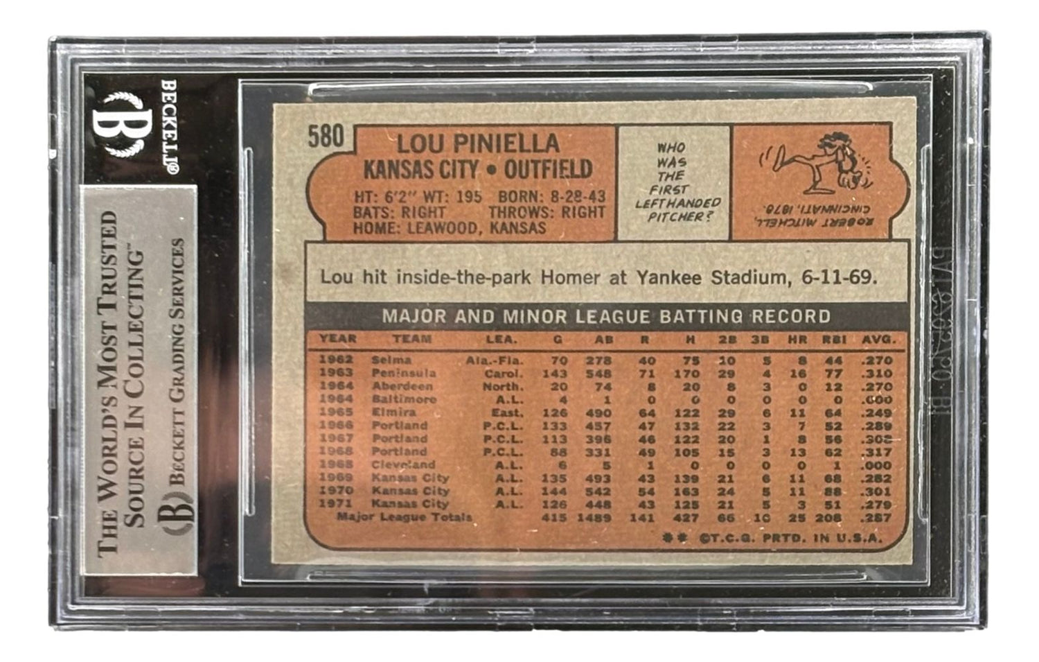 Celebrate baseball history with this authentic Lou Piniella signed 1972 Topps #580 trading card. A standout piece for any New York Yankees fan or serious memorabilia collector, this vintage card captures Piniella during a pivotal moment in his career. Known for his fiery passion and later success as a manager, Lou Piniella made a lasting impact on Major League Baseball both on and off the field. This signed card has been professionally authenticated and encapsulated by Beckett, ensuring its legitimacy and preserving its condition for years to come. Whether you're building a Yankees-themed collection or commemorating iconic MLB players from the 1970s, this card is a must-have.