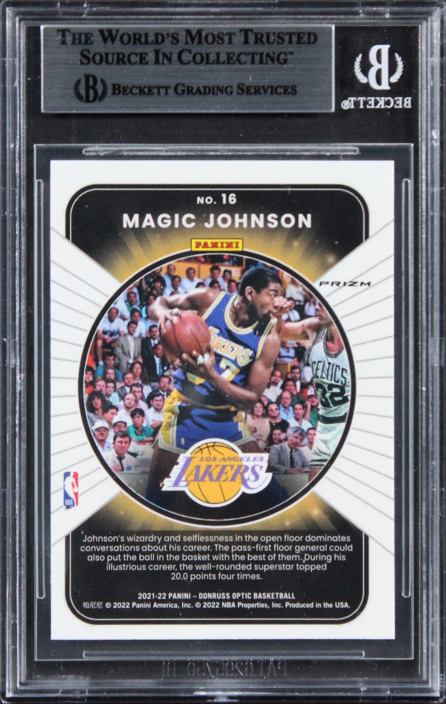 This card highlights the popular "Winner Stays" theme from Donruss Optic's 2021 release, featuring a dazzling Holo finish that captures the spotlight—just like Magic did on the court. Preserved in a securely slabbed holder and authenticated by Beckett Authentication Services (BAS), this item ensures both value and authenticity for any collection.
