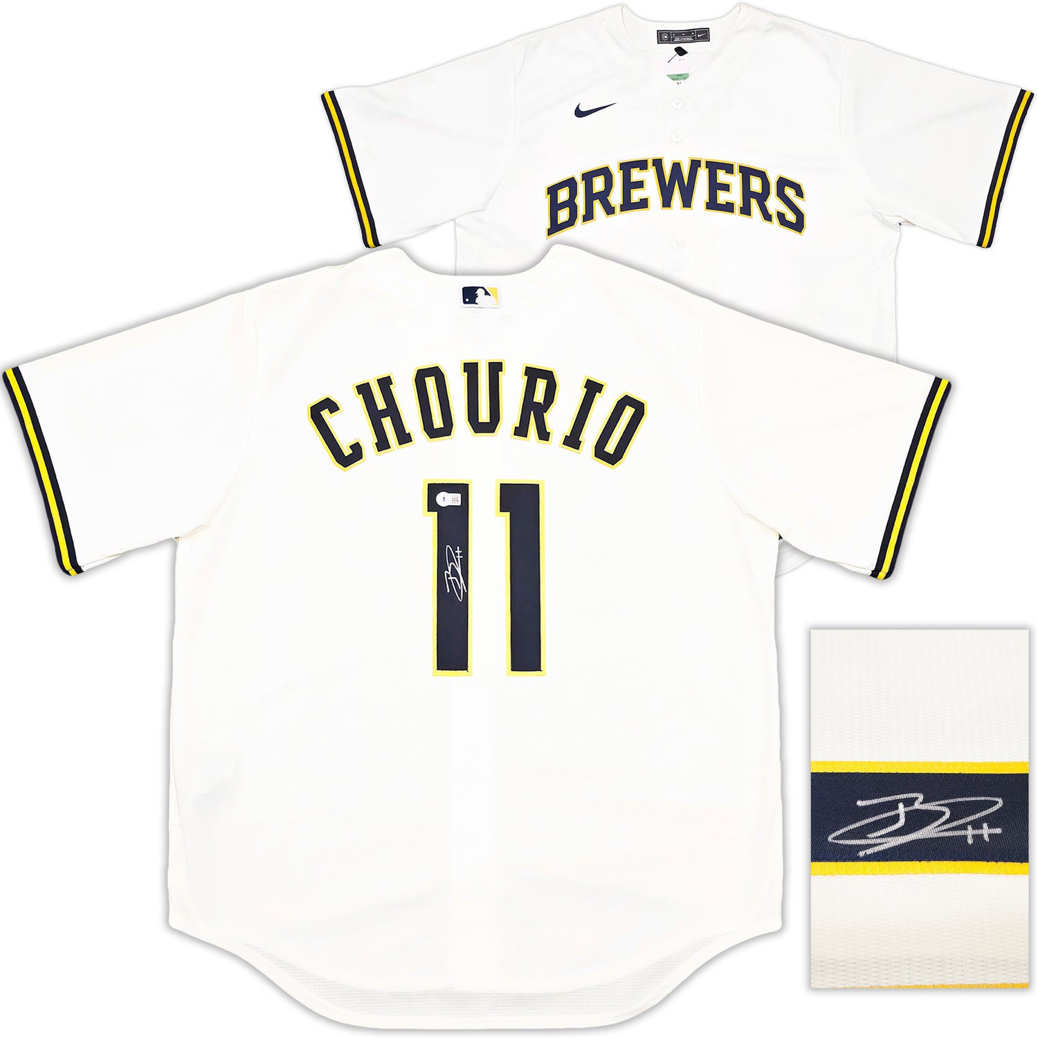 Celebrate the rising talent of the Milwaukee Brewers with this officially signed Cream Nike Milwaukee Brewers Jersey autographed by top prospect Jackson Chourio. Known for his electrifying speed and dynamic playmaking ability, Chourio has captured the attention of MLB scouts and fans alike, making this collectible a must-have for Brewers fans and memorabilia collectors. Whether you're a die-hard supporter or an investor in future baseball legends, this jersey is the perfect tribute to a star on the rise. Authenticated by Beckett Authentication Services (BAS), you can purchase with confidence knowing you're getting a genuine signature backed by one of the industry’s most trusted names.