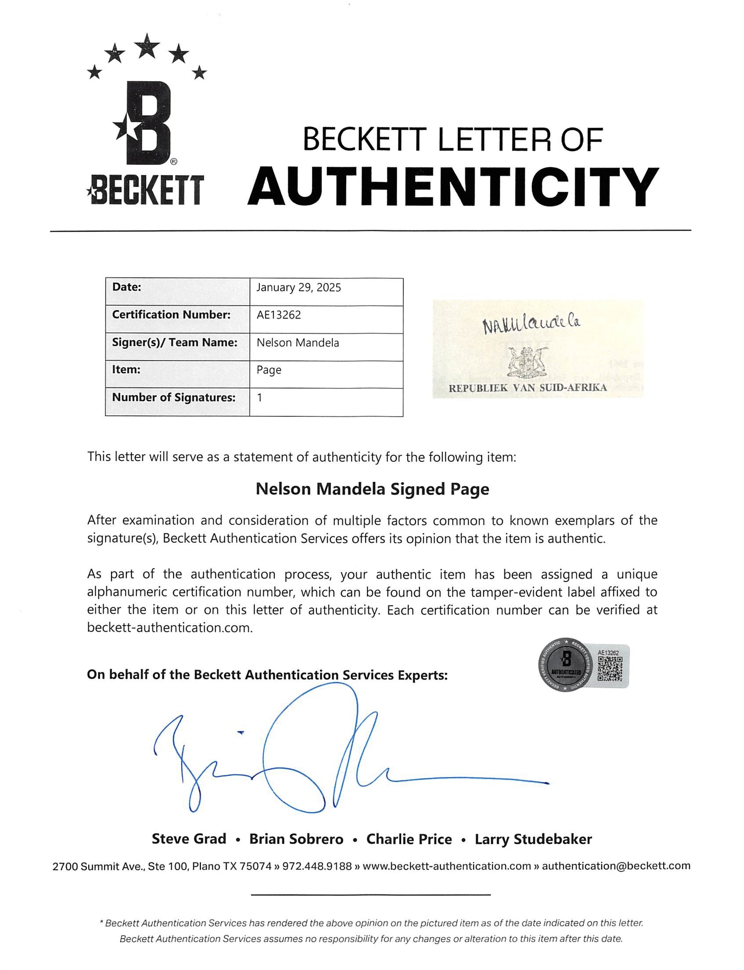 Own a rare piece of history with this Autographed 5.5x8 South African Constitution Booklet Page Framed Display personally signed by Nelson Mandela. A powerful tribute to one of the most iconic leaders of the 20th century, this collectible celebrates Mandela’s enduring legacy and the monumental significance of South Africa’s democratic transformation. Authenticated by one of the most respected names in the industry, this is a must-have for collectors of political, cultural, and historical memorabilia alike.