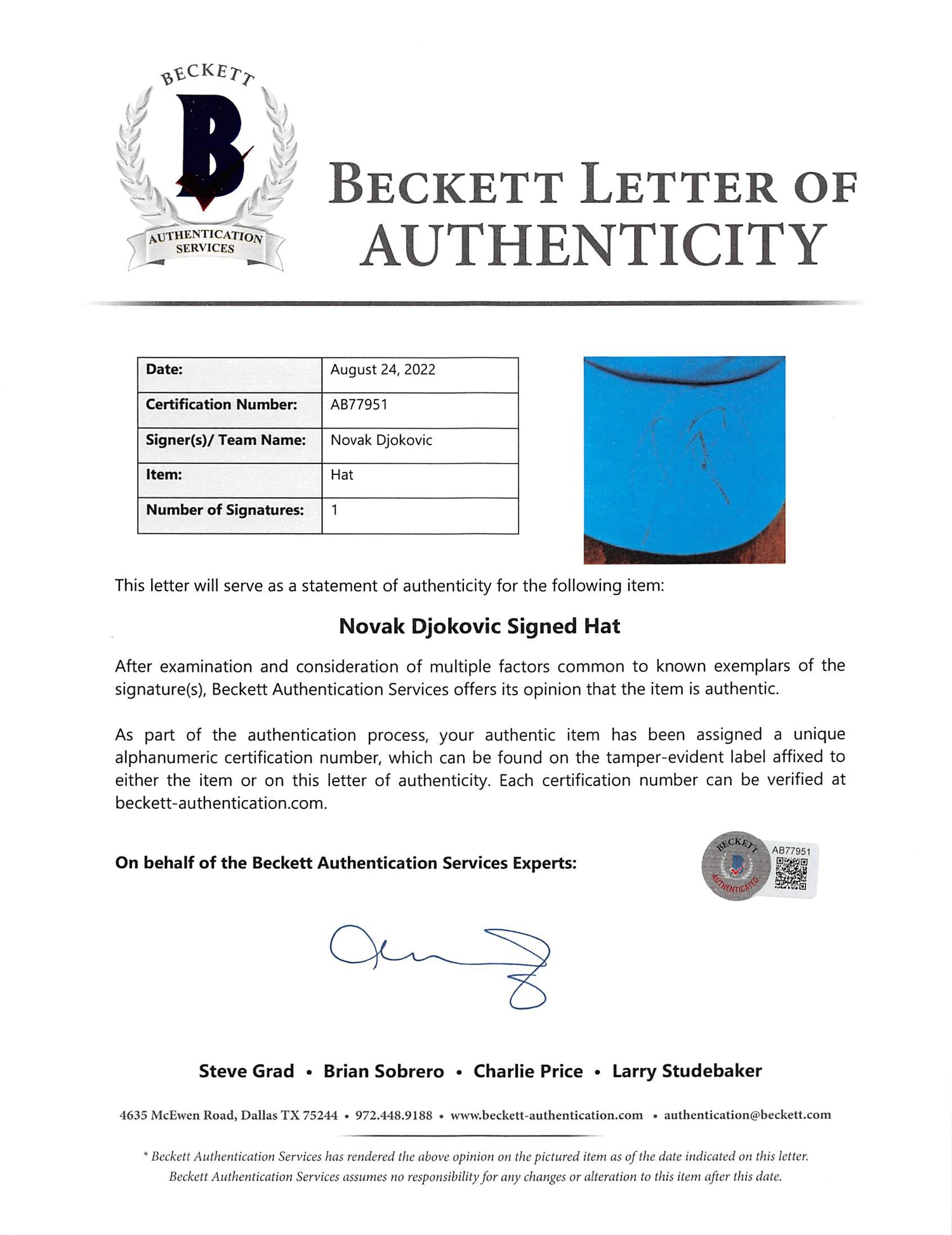 Own a rare piece of tennis history with this Autographed Blue Lacoste Match Used Hat signed by Novak Djokovic, one of the greatest tennis players of all time. A true collector’s item, this hat reflects Djokovic’s remarkable career, marked by Grand Slam titles, Olympic appearances, and his iconic style both on and off the court. Though the exact match this hat was worn in is not confirmed, the use and visible wear align with items used in professional play—adding to its authenticity and allure for serious collectors and tennis enthusiasts alike.