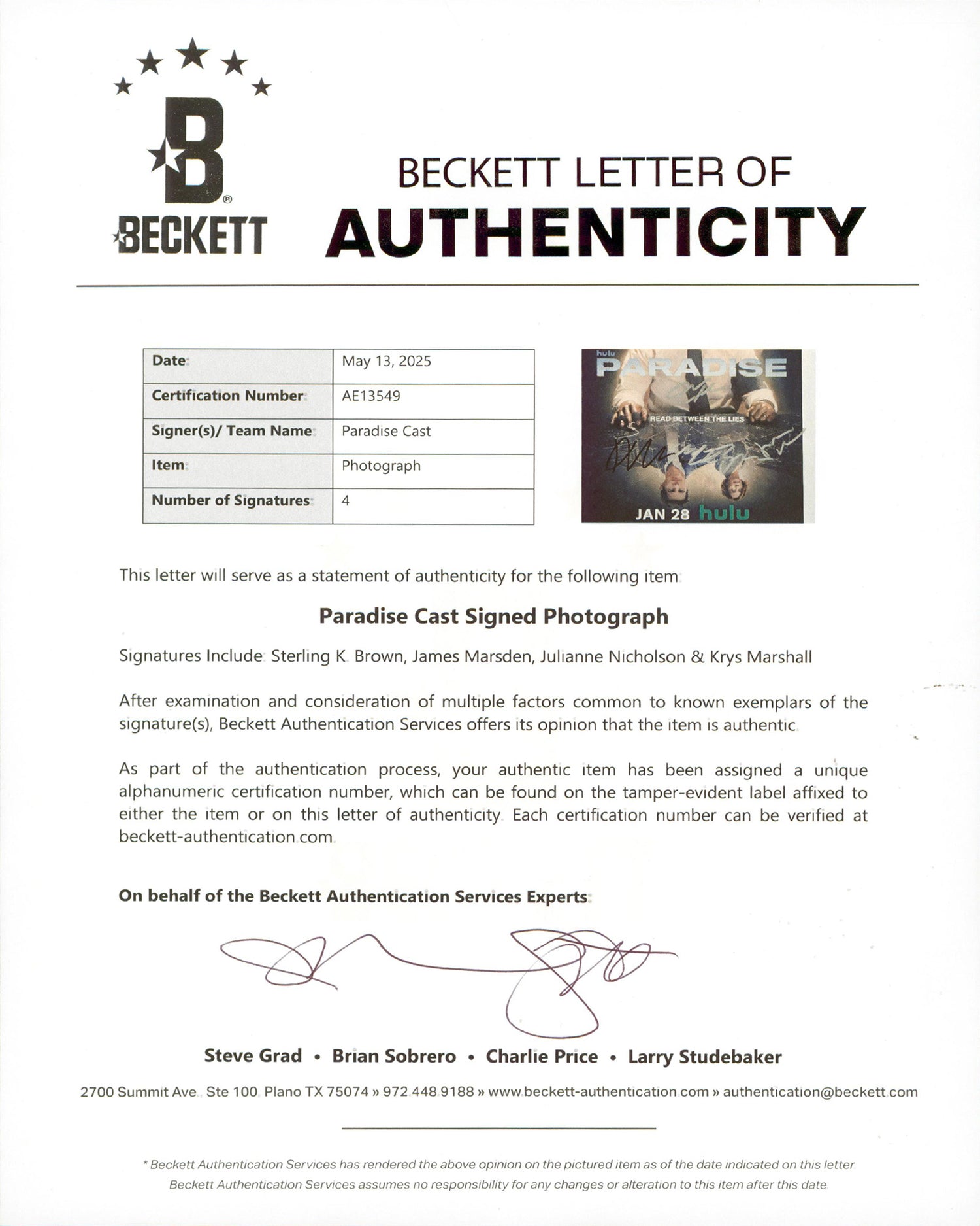 - Personally hand-signed by Sterling K. Brown, James Marsden, Julianne Nicholson & Krys Marshall – four of the standout stars from the acclaimed series "Paradise"