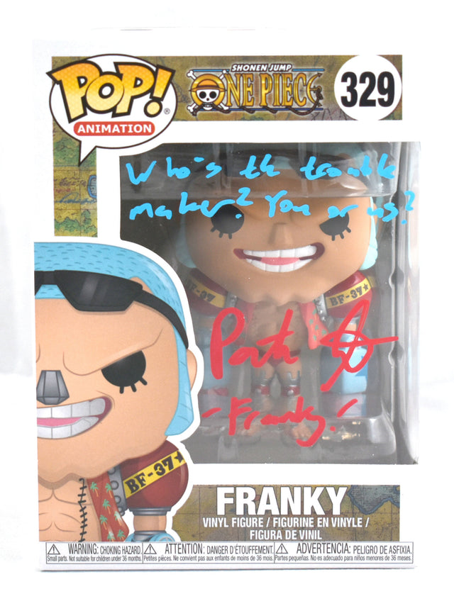 Own a piece of anime and Funko Pop history with this Patrick Seitz autographed Franky Funko Pop Figurine (#329), a must-have for fans of One Piece and collectors alike. This exclusive collectible features Patrick Seitz's hand-signed autograph, complete with an inscription, making it a standout addition to any collection.