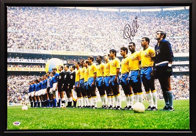 Own a piece of soccer history with this framed 16x23.5 canvas, approximately 18x26, hand-signed by Pelé, one of the greatest footballers of all time. This stunning collectible celebrates the legacy of the Brazilian legend, making it a must-have for serious sports memorabilia collectors and soccer enthusiasts.