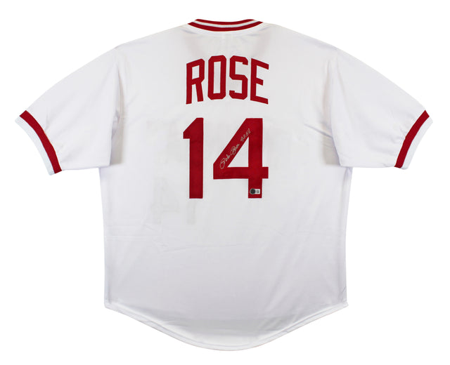 Own a piece of baseball history with this Pete Rose Autographed White Pro Style Jersey featuring a silver signature and the iconic "4256" inscription, honoring his all-time hits record. Personally signed by the Cincinnati Reds legend, this jersey is a must-have for dedicated collectors and fans alike.
