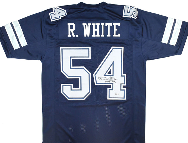 This is a custom-made, authentic style jersey (not an official NFL/brand-name jersey), featuring stitched letters and numbers. The jersey is inscribed with "HOF" to commemorate Randy White’s Hall of Fame status. An excellent display piece that adds historic value to any Cowboys fan’s collection.