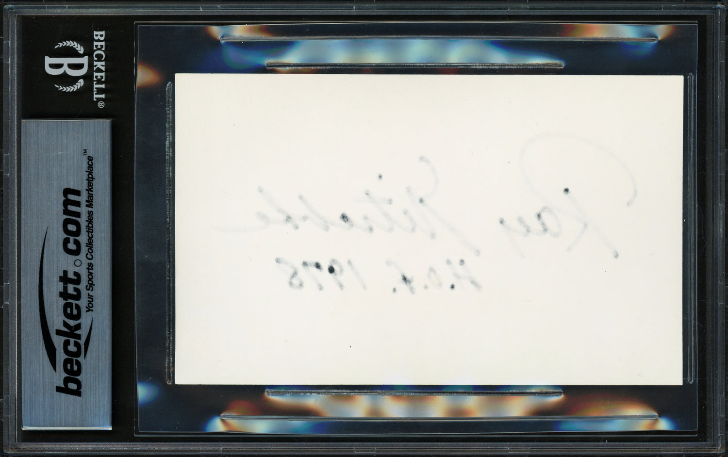 This collectible is a must-have for fans of legendary Green Bay Packers linebacker Ray Nitschke and NFL history enthusiasts. Featuring a hand-signed 3x5 Index Card with the personal inscription "HOF 1978", this piece commemorates Nitschke’s 1978 induction into the Pro Football Hall of Fame. Known for his fierce defensive presence during the 1960s, Nitschke helped lead the Green Bay Packers to five NFL Championships under coach Vince Lombardi, including victories in Super Bowl I and II. This signature has been officially authenticated by Beckett Authentication Services (BAS) and is secured inside their tamper-proof encapsulated holder, ensuring long-term preservation and display value.