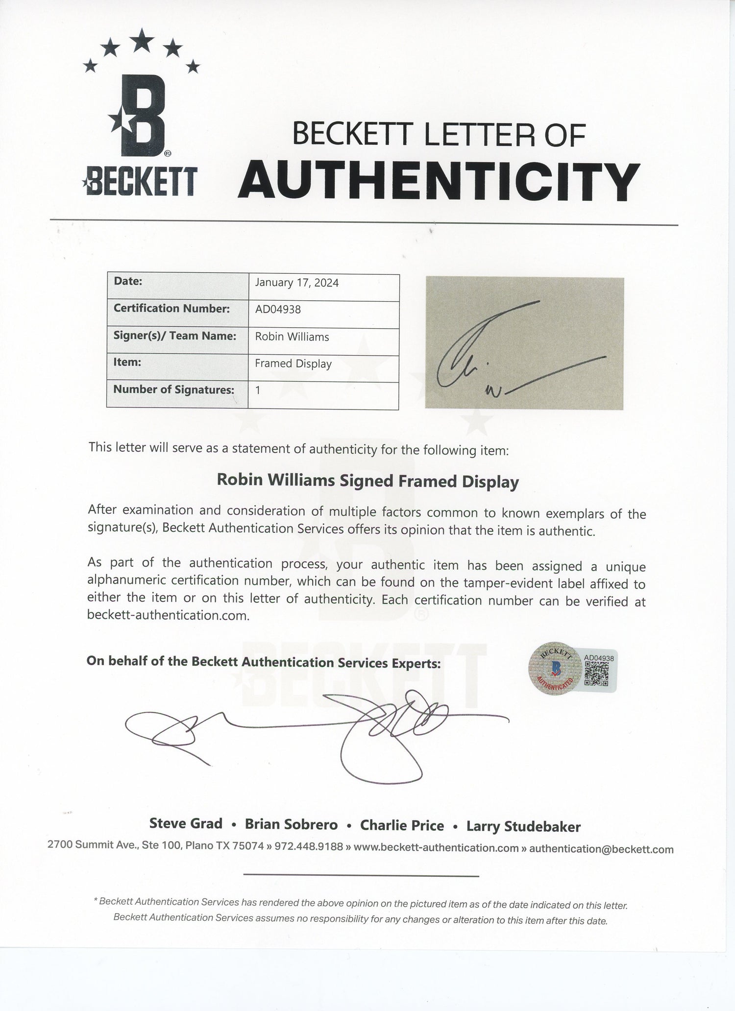 - Authenticity Guaranteed: - The Robin Williams autograph is certified with a Beckett Authentication Services (BAS) hologram, featuring a scannable QR code for instant verification on Beckett's website. - The Sally Field signature is authenticated by PSA/DNA, with an official PSA/DNA numbered hologram as verification. (Note: PSA/DNA no longer issues serial-numbered COA cards; the sticker itself serves as official authentication.)
