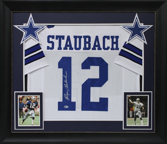 This signed Roger Staubach jersey is the perfect addition to any Dallas Cowboys memorabilia collection. Whether you're celebrating the legendary career of "Captain America" or looking for a statement piece, this framed jersey is a timeless investment.