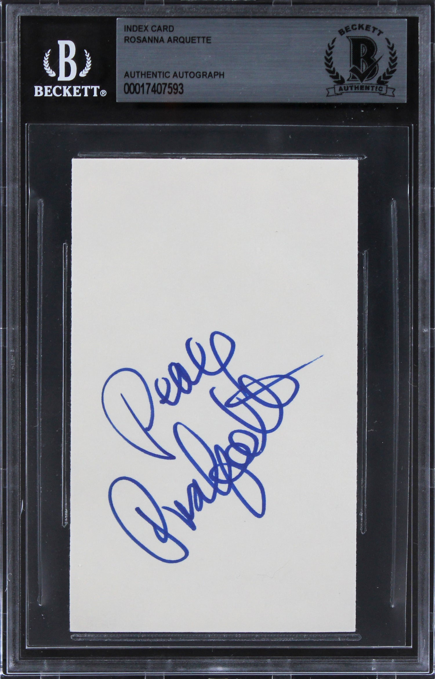Own a unique piece of pop culture history with this Rosanna Arquette Autographed 3x5 Index Card featuring the inscription "Peace." A must-have for movie enthusiasts and collectors, this rare signature is authenticated and encapsulated by Beckett Authentication Services, ensuring its 100% authenticity.