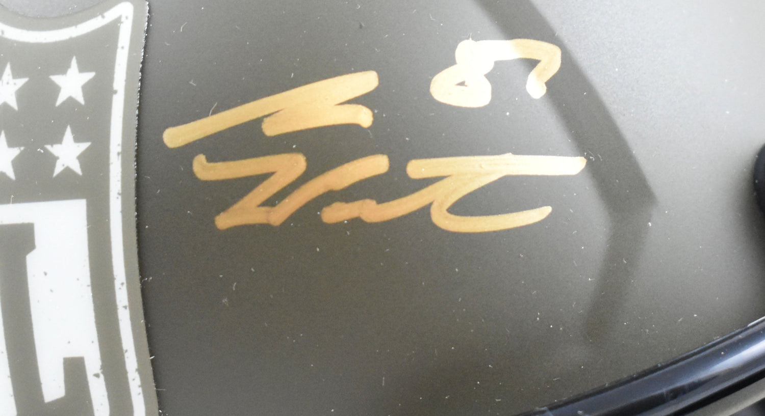 Celebrate the rising legacy of the NFL with this exclusive, double-signed collectible — a Riddell Salute to Service Speed Mini Helmet autographed by George Kittle and Sam LaPorta. Whether you're a die-hard fan of the gridiron or a serious memorabilia collector, this piece captures the spirit of two of the league’s most dynamic tight ends. George Kittle, a Pro Bowl mainstay for the San Francisco 49ers, and Sam LaPorta, a breakout rookie star with an electrifying future, combine in this rare dual-signature item that honors both NFL excellence and military tribute through the iconic Salute to Service design.
