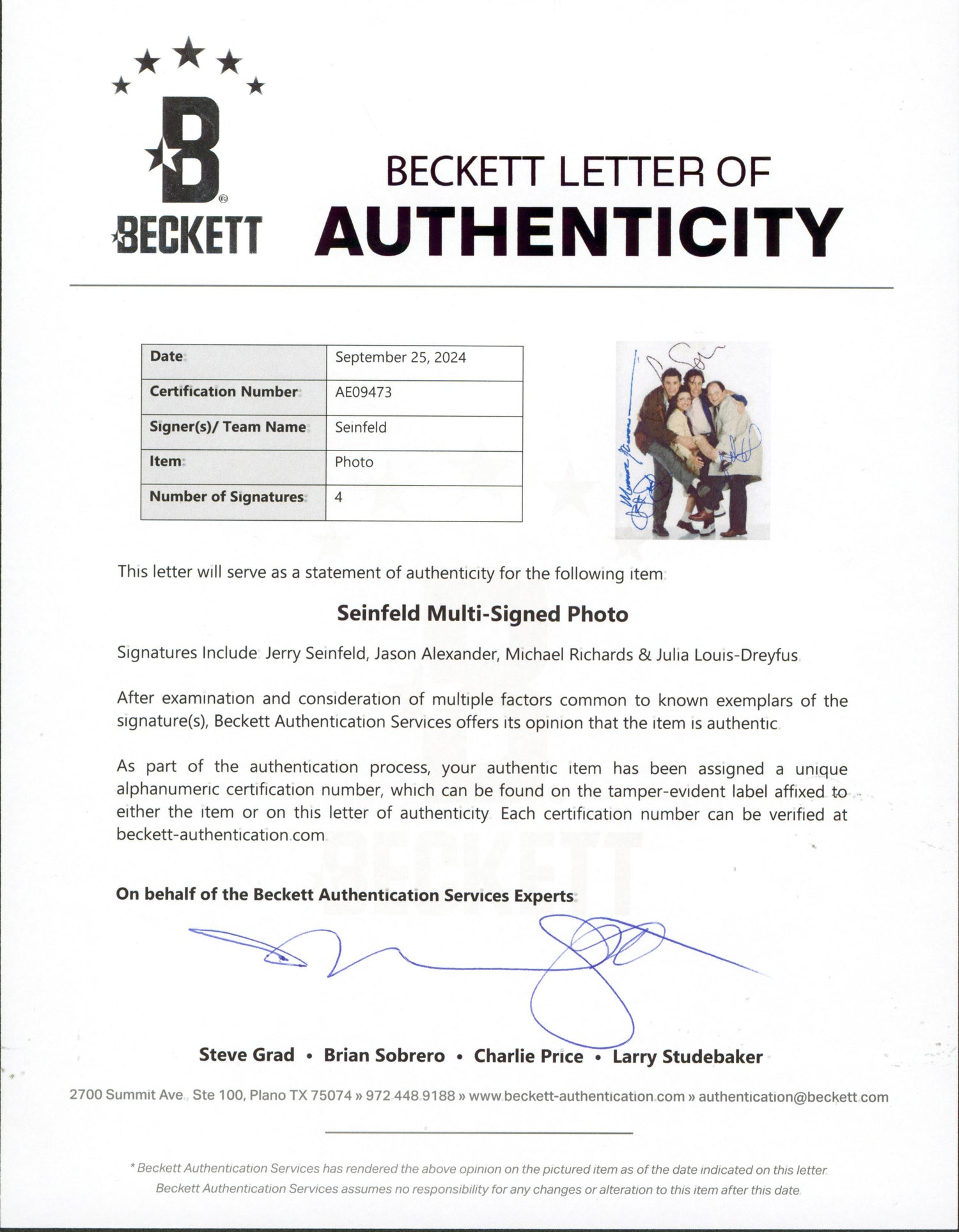 - Authentic Autographs – Hand-signed by all four main cast members of Seinfeld: Jerry Seinfeld, Jason Alexander, Michael Richards, and Julia Louis-Dreyfus.