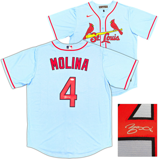 This Light Blue Nike St. Louis Cardinals Jersey has been hand-signed by legendary catcher Yadier Molina, making it a must-have collectible for Cardinals fans and memorabilia enthusiasts. A key piece for any collection, this jersey celebrates Molina's incredible career and contributions to the St. Louis Cardinals.