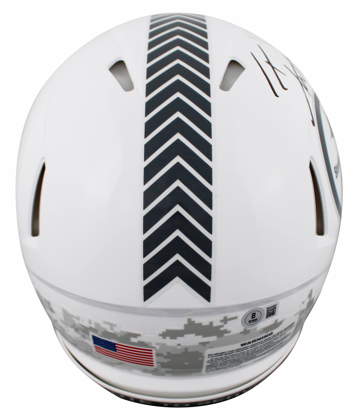 This exclusive Steelers helmet celebrates Salute To Service 2024, a tribute to the military, making it an even more meaningful addition to any collection. Please note that while the photos provided represent the item, signature placement, size, and strength may vary per piece. Beckett has transitioned away from serial-numbered COA cards, so the affixed BAS sticker serves as the complete authentication.
