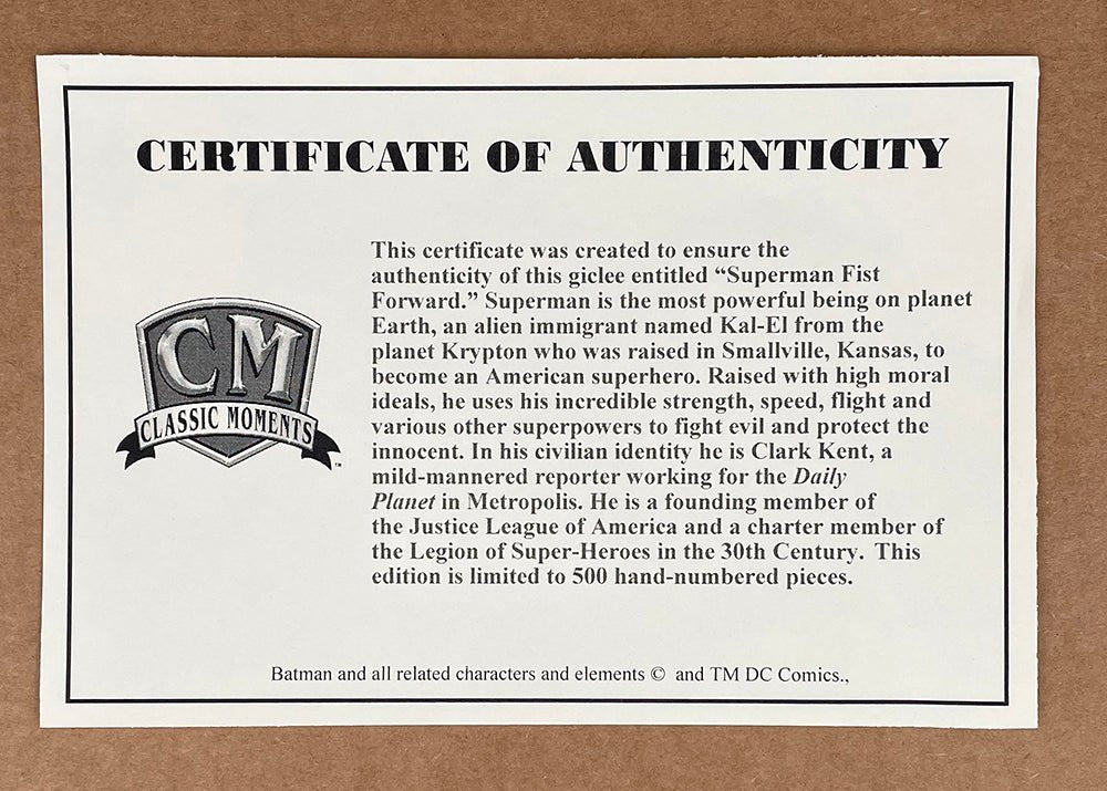 - Limited Edition Art – A stunning giclee print of Superman, capturing the enduring legacy of this legendary DC Comics superhero.