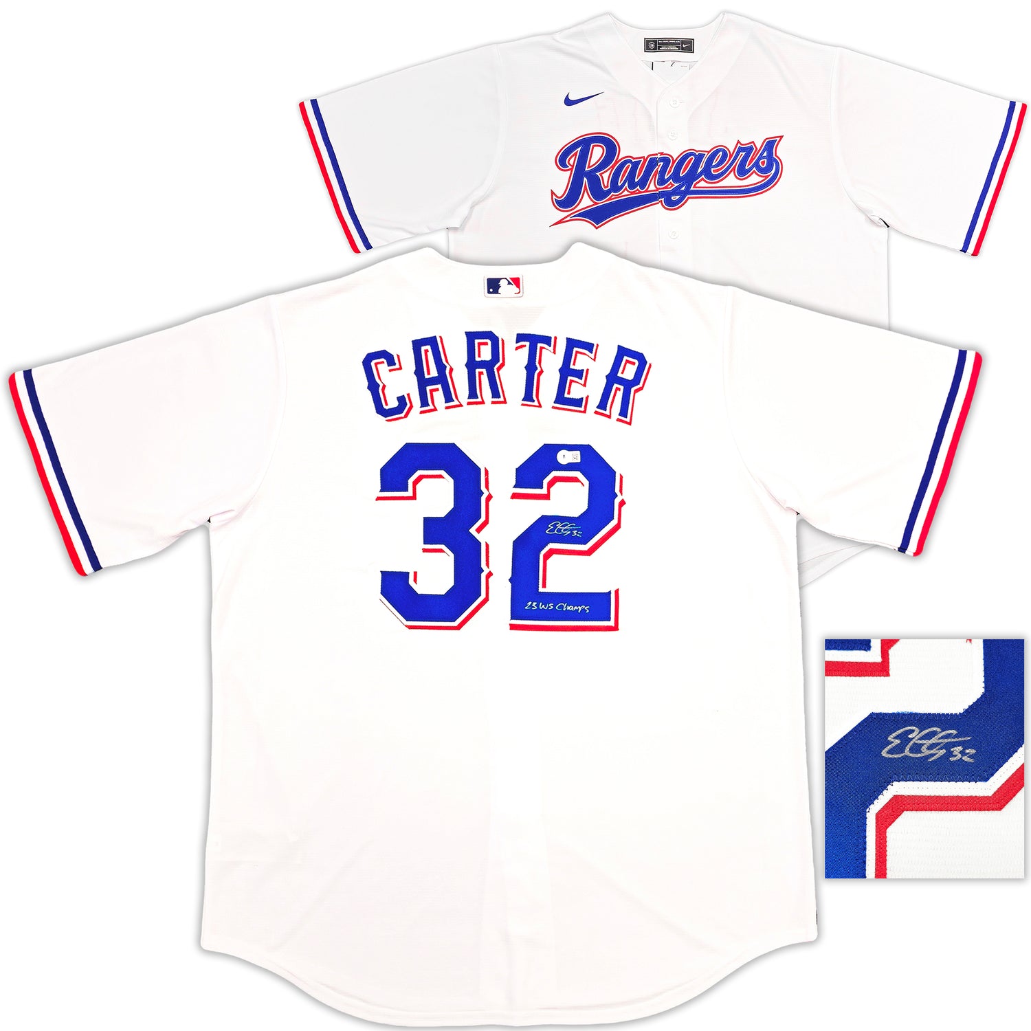 Texas Rangers Evan Carter Autographed White Nike Jersey Size XLT "23 WS Champs" Beckett BAS Witness Stock #236695