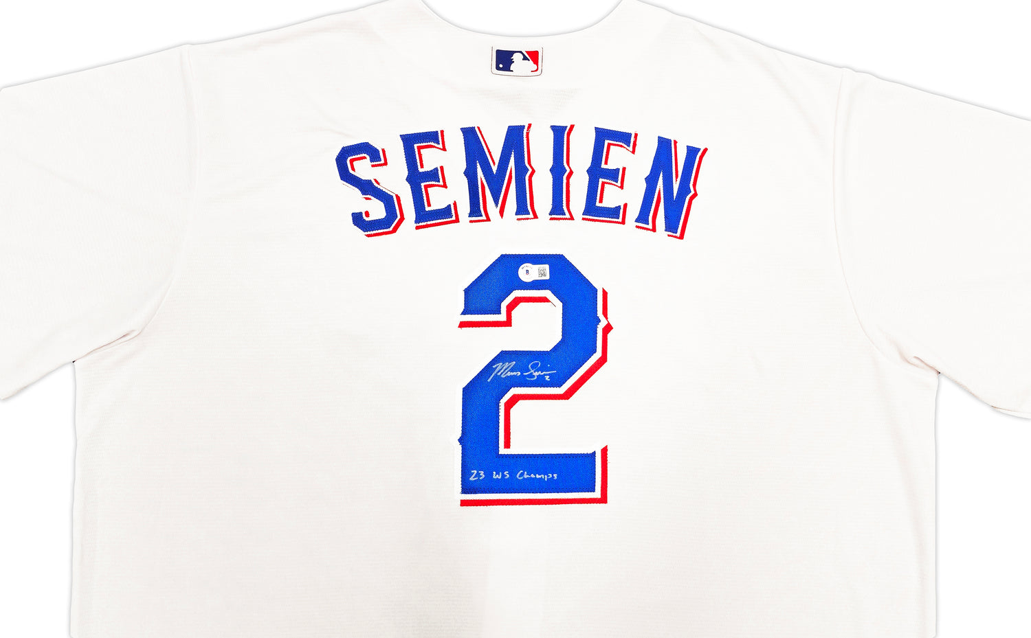 Own a piece of Texas Rangers history with this White Nike Texas Rangers Jersey, hand-signed by Marcus Semien. This exclusive collectible celebrates the Rangers' incredible 2023 World Series Championship and is a must-have for passionate fans and memorabilia collectors.
