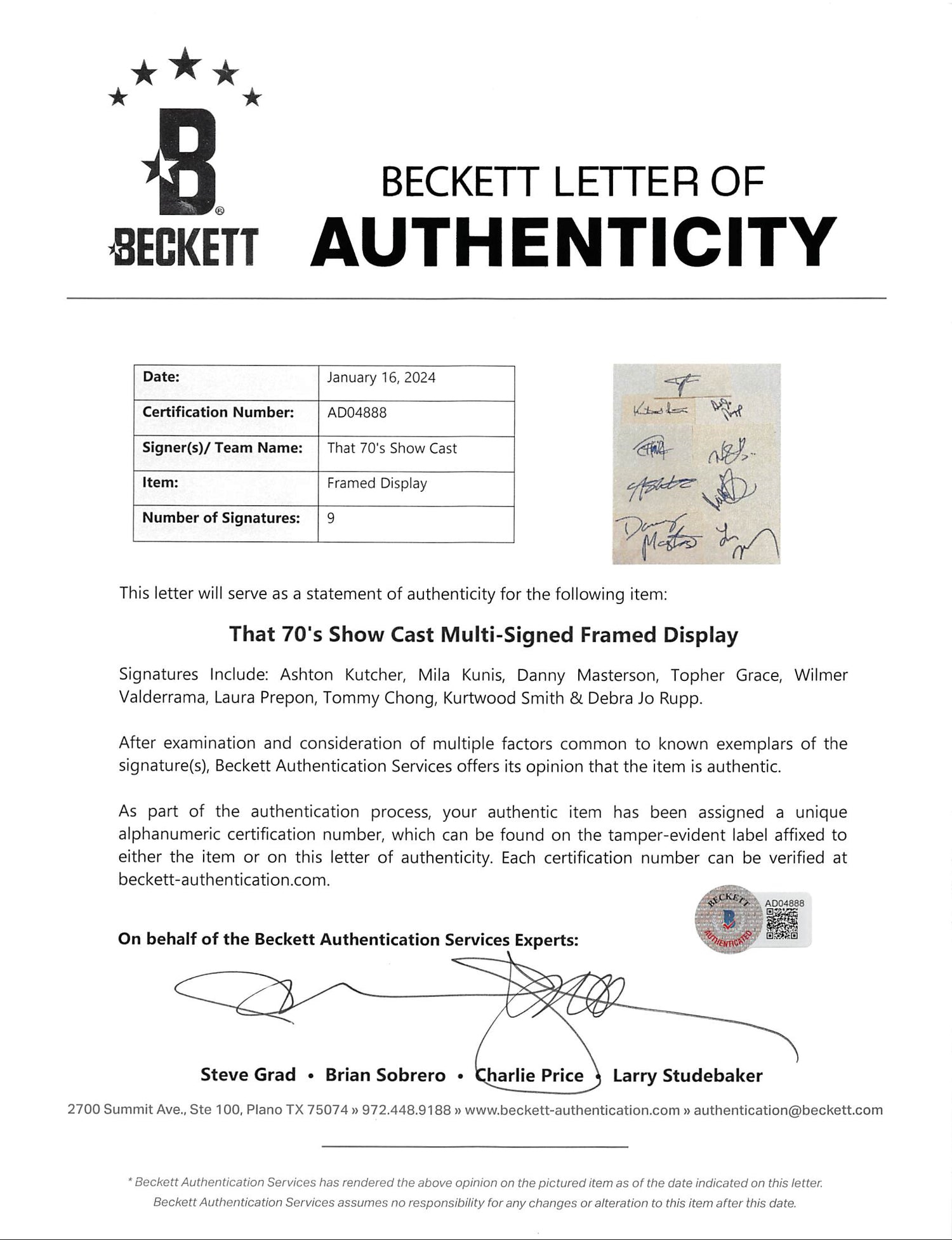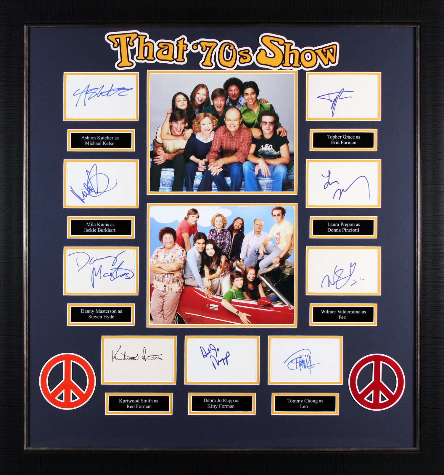 Own a piece of television history with this Autographed Framed Display signed by the beloved cast of That '70s Show. This rare collector's item features authentic signatures from Ashton Kutcher, Mila Kunis, Topher Grace, Wilmer Valderrama, Laura Prepon, Tommy Chong, Kurtwood Smith, Debra Jo Rupp, and Danny Masterson. Perfect for fans and memorabilia collectors, this professionally framed display captures the spirit of one of the most iconic sitcoms of all time.