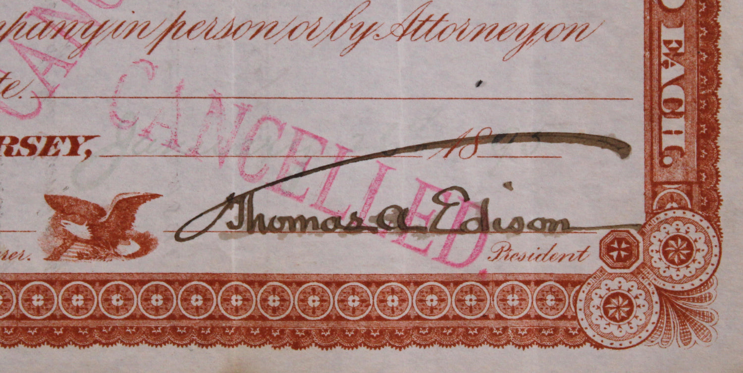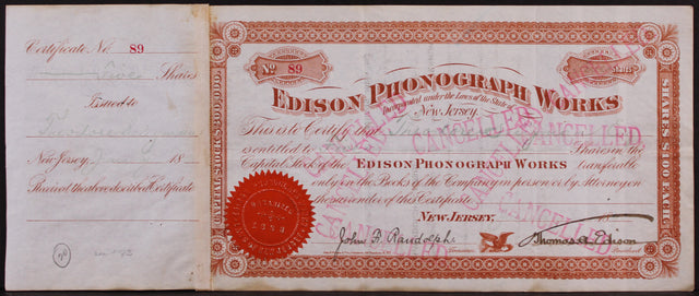 - Cancelled Edison Phonograph Works stock certificate—a 5.75x14 document reflecting early 20th-century American innovation.