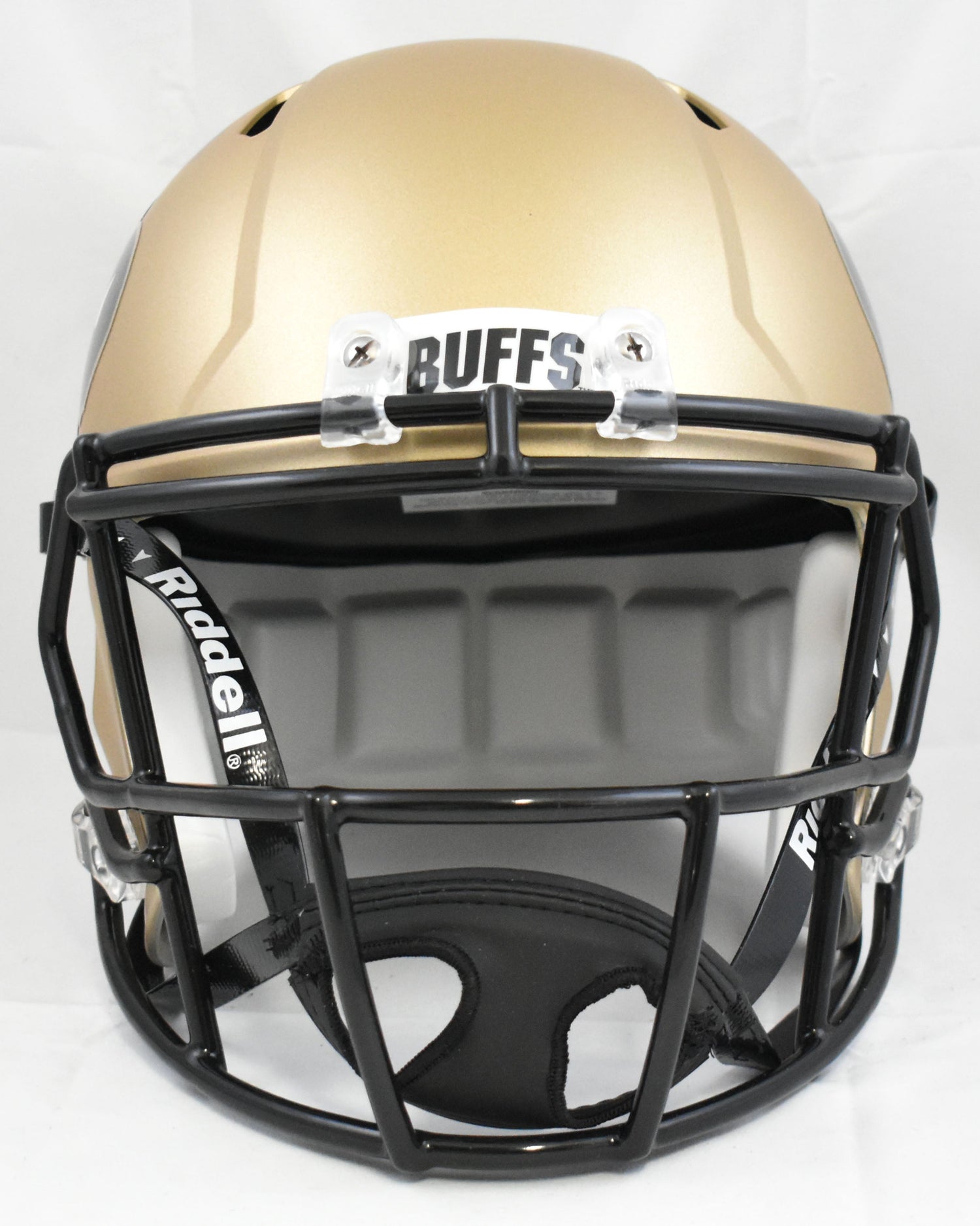 Celebrate one of college football's brightest stars with this Travis Hunter autographed Riddell full-size Speed Replica helmet, proudly representing the Colorado Buffaloes. An elite two-way player, Travis Hunter has become a standout name under head coach Deion Sanders, thrilling fans with his incredible talent on both sides of the ball. This helmet is more than just a collectible—it's a piece of modern NCAA football history, perfect for fans of the Buffaloes or collectors of future NFL legends.