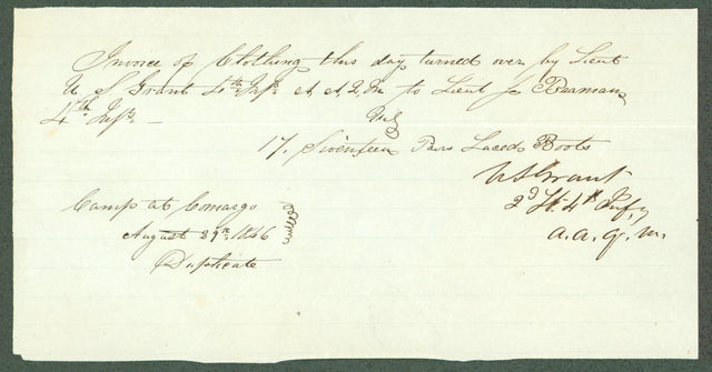 Own a rare piece of American military and presidential history with this Authentic Ulysses S. Grant Signed 4x8 Military Document, dated August 29, 1846, from the Mexican-American War era. This historic document, issued from the Camp at Camargo, features Grant’s prominent and boldly written signature as "US Grant 2d Lt 4th Infy A.A.G.M."—a title he held as Acting Assistant Quartermaster during his early military career. Highlighting the transfer of 17 pairs of laced boots between officers, this original field supply invoice showcases the disciplined logistics behind America’s military campaigns and the foundational moments of Grant’s rise to prominence. At the time, Grant had begun distinguishing himself for bravery, notably leading a daring charge during the Battle of Resaca de la Palma on May 9, 1846, setting the stage for his legendary leadership during the Civil War and eventual U.S. presidency.
