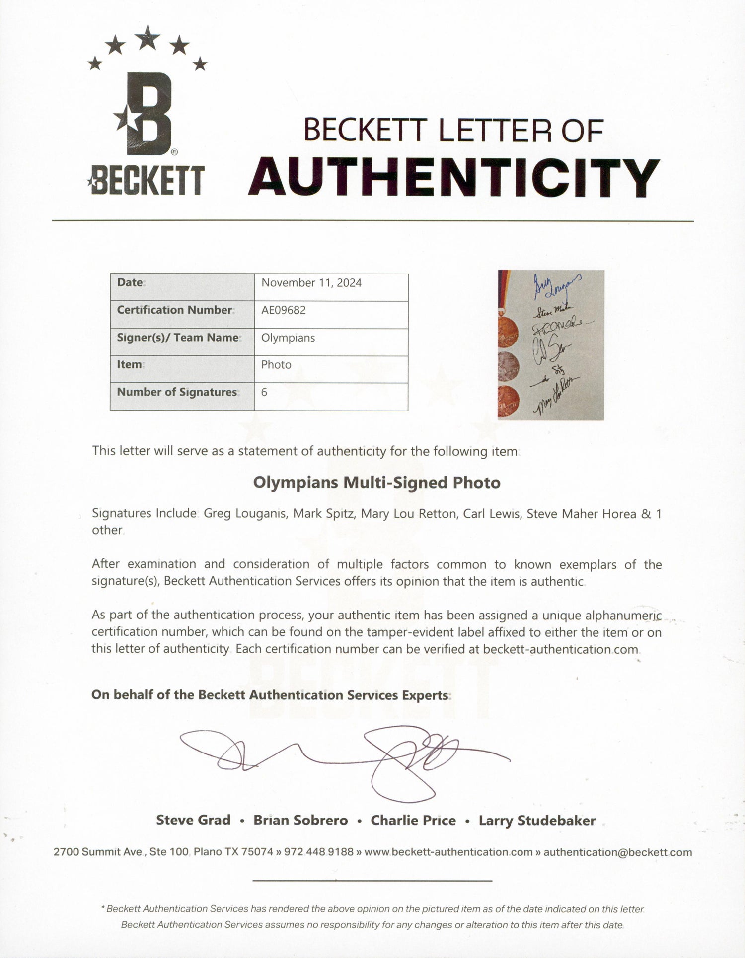 Own a piece of sports history with this Autographed 8x10 Photo personally signed by legendary athletes Greg Louganis, Mark Spitz, Mary Lou Retton, Carl Lewis, and Steve Maher Horea. This rare collectible celebrates some of the greatest champions in Olympic and sports history, making it a must-have for dedicated collectors and fans.