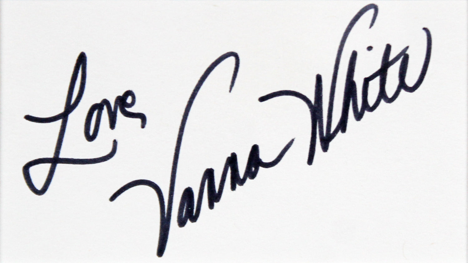 Own a piece of television history with this Vanna White & Pat Sajak Autographed 3x5 Index Card Framed Display, featuring the heartfelt inscription "Love (White)". As beloved hosts of Wheel of Fortune for decades, their signatures make this an incredible collectible for fans of classic game shows and pop culture memorabilia.