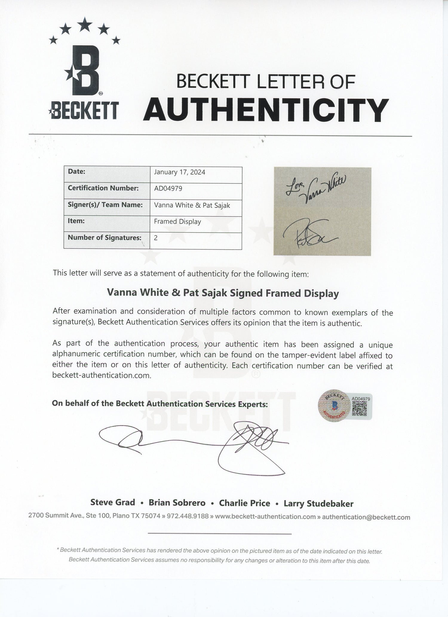 Celebrate the legacy of one of television’s most enduring game shows with this rare signed Vanna White & Pat Sajak display. Ideal for framing in your home, office, or memorabilia collection!