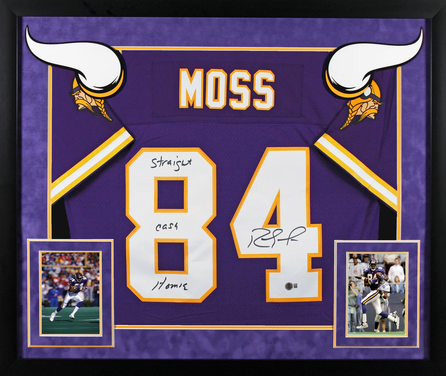 Vikings Randy Moss "Straight Cash Homie" Signed Purple M&N Framed Jersey BAS Wit